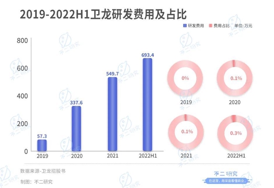 门槛低也体现在较低的研发费用上。招股书数据显示,2019-2022上半年,卫龙的研发投入分别为57.3万、337.6万549.7万和693.4万,仅占总收入的0.3%左右。