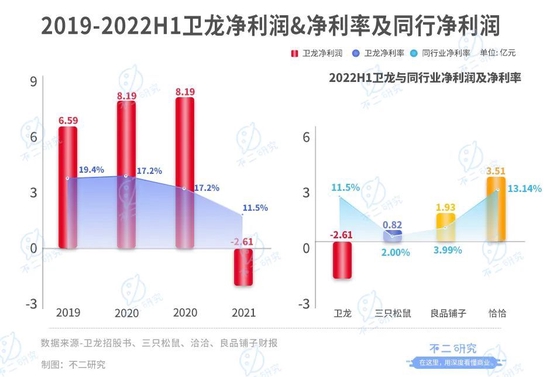 “不二研究”发现,卫龙的净利润和净利润率都很高:2019-2022上半年,其净利润分别为6.58亿、8.19亿、8.27亿和-2.61亿,净利率分别为19.4%、19.9%、17.2%和11.5%。